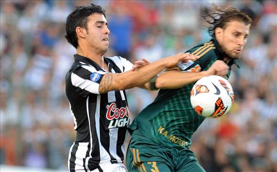 Zagueiro Henrique (dir.), do Palmeiras, no jogo contra o Libertad